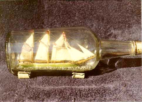 Below is a picture of the "LETTIE MAY" encased in a bottle. This model was made to the exact measurements of the ship. When it was finished the rigging and sails were folded down and the ship was slipped into the bottle, then the lines that were attached to the rigging and sails were pulled and the rigging and sails were upright again. The lines were tied off with long needle nose pliers, and the cork was slipped into place; encasing forever the model of the "LETTIE MAY".
