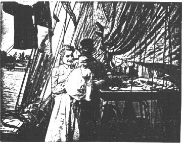 Captain Wallace and Emma Van Dyke became parents of a baby girl they named Florence on November 28, 1897. She was born in Chicago, Illinois. Below is a photo taken on the "LETTIE MAY" of this proud family. You can see little Florence's diapers hanging on the rigging. Captain Wallace is standing so that it will not be noticed that his right arm is missing.